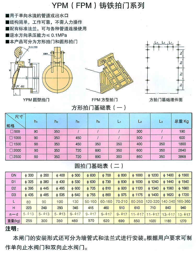 拍門規(guī)格分圓形拍門和方形拍門兩種,可根據(jù)出水口大小形狀設(shè)計生產(chǎn);拍門類別可分別為空心浮板式拍門和平板式拍門。