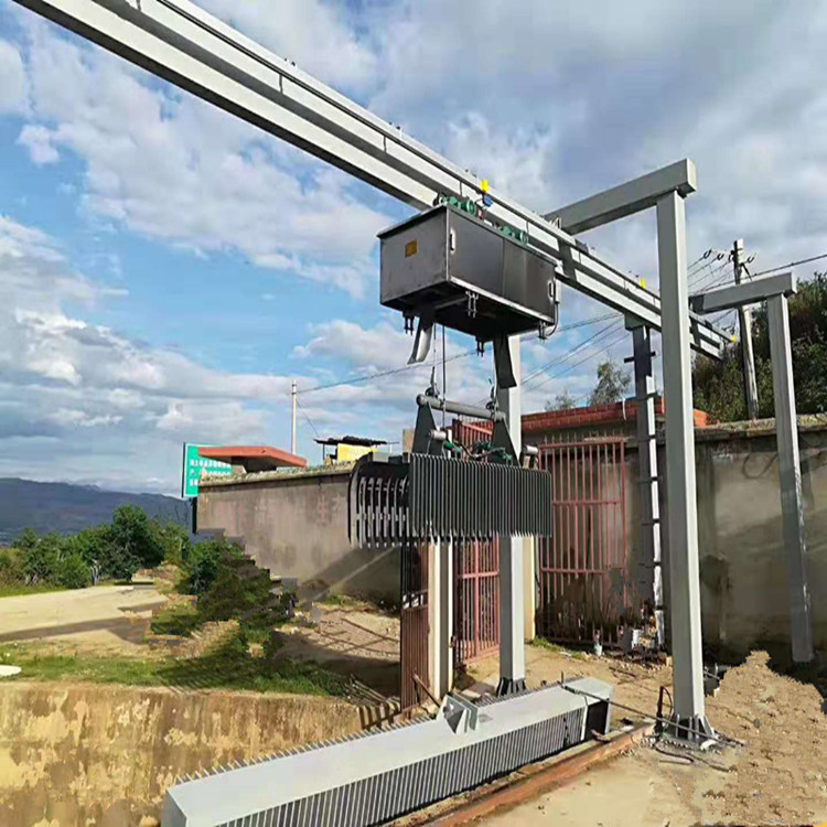 移動(dòng)式格柵清污機(jī)結(jié)構(gòu) 移動(dòng)式格柵整機(jī)包括格柵片、機(jī)架、工作平臺(tái)、行走機(jī)構(gòu)、清污機(jī)構(gòu)、翻耙機(jī)構(gòu)、垃圾小車(chē)、18kg/m輕軌、過(guò)載保護(hù)裝置、鋼絲繩防松裝置及行程控制、電氣控制箱。電源、驅(qū)動(dòng)執(zhí)行結(jié)構(gòu)和控制系統(tǒng)、電控箱等驅(qū)動(dòng)執(zhí)行結(jié)構(gòu)和控制系統(tǒng)位于機(jī)架上,同時(shí)為施工單位提供相關(guān)預(yù)留預(yù)埋件。