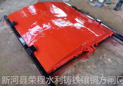 生產(chǎn)鑄鐵鑲銅閘門,鑄鐵鑲銅方閘門由門框、閘板、導(dǎo)軌、密封條、傳動螺桿、吊塊螺母/吊耳和可調(diào)整密封機構(gòu)等部件組成,其中門框和閘板均由優(yōu)質(zhì)灰口鑄鐵或球墨鑄鐵制成,導(dǎo)軌左右對稱布置且用不銹鋼螺栓定位銷與門框二側(cè)端部連接 (對中小口徑的閘門,其導(dǎo)軌可與門框澆注成一體),導(dǎo)軌長度一般為閘門全開啟高度的1/2~1/3,因而整體結(jié)構(gòu)強度高、剛性高、耐磨、耐腐蝕性好、承壓能力大。